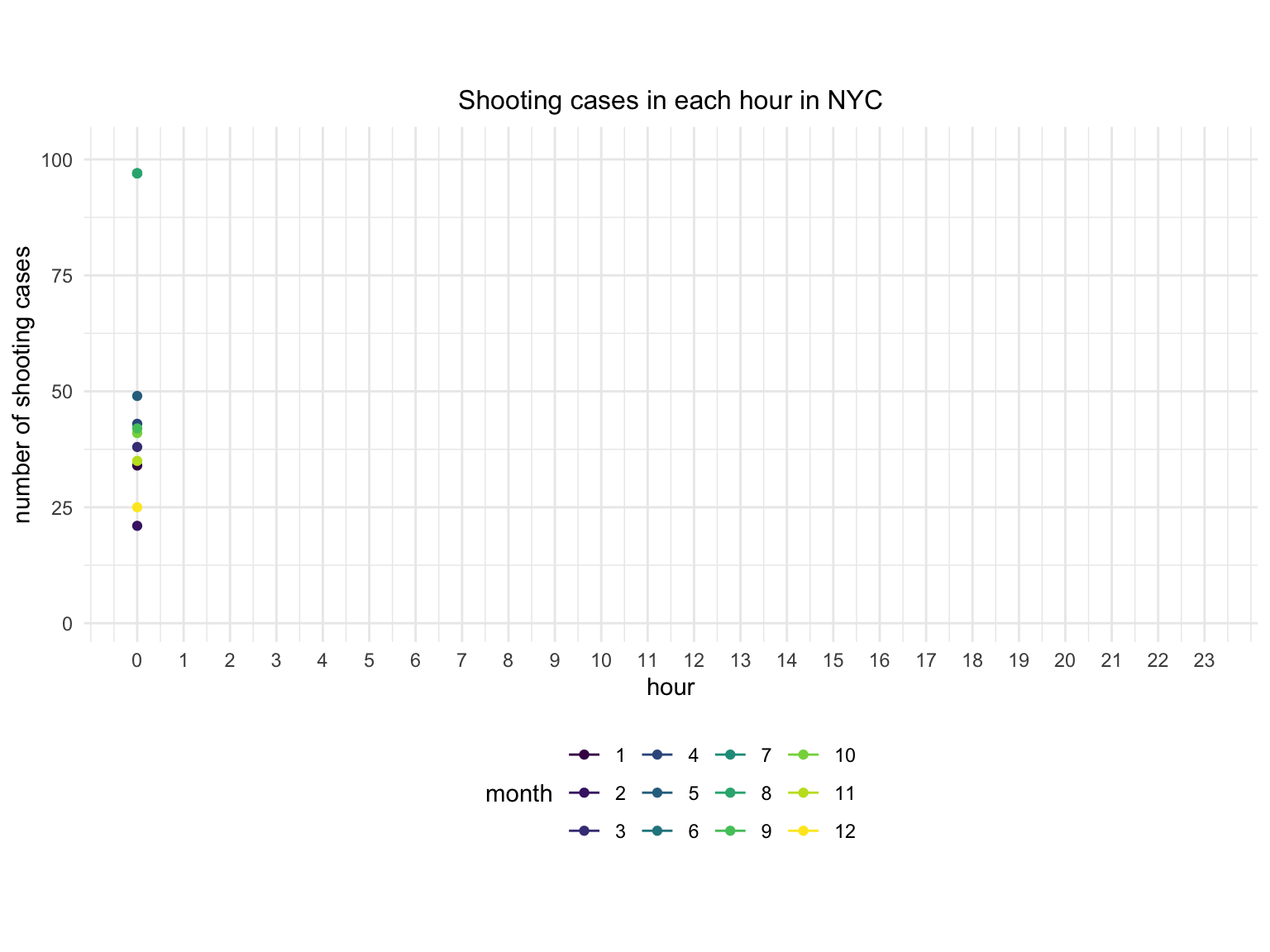 title = "Shooting cases in each hour in NYC",