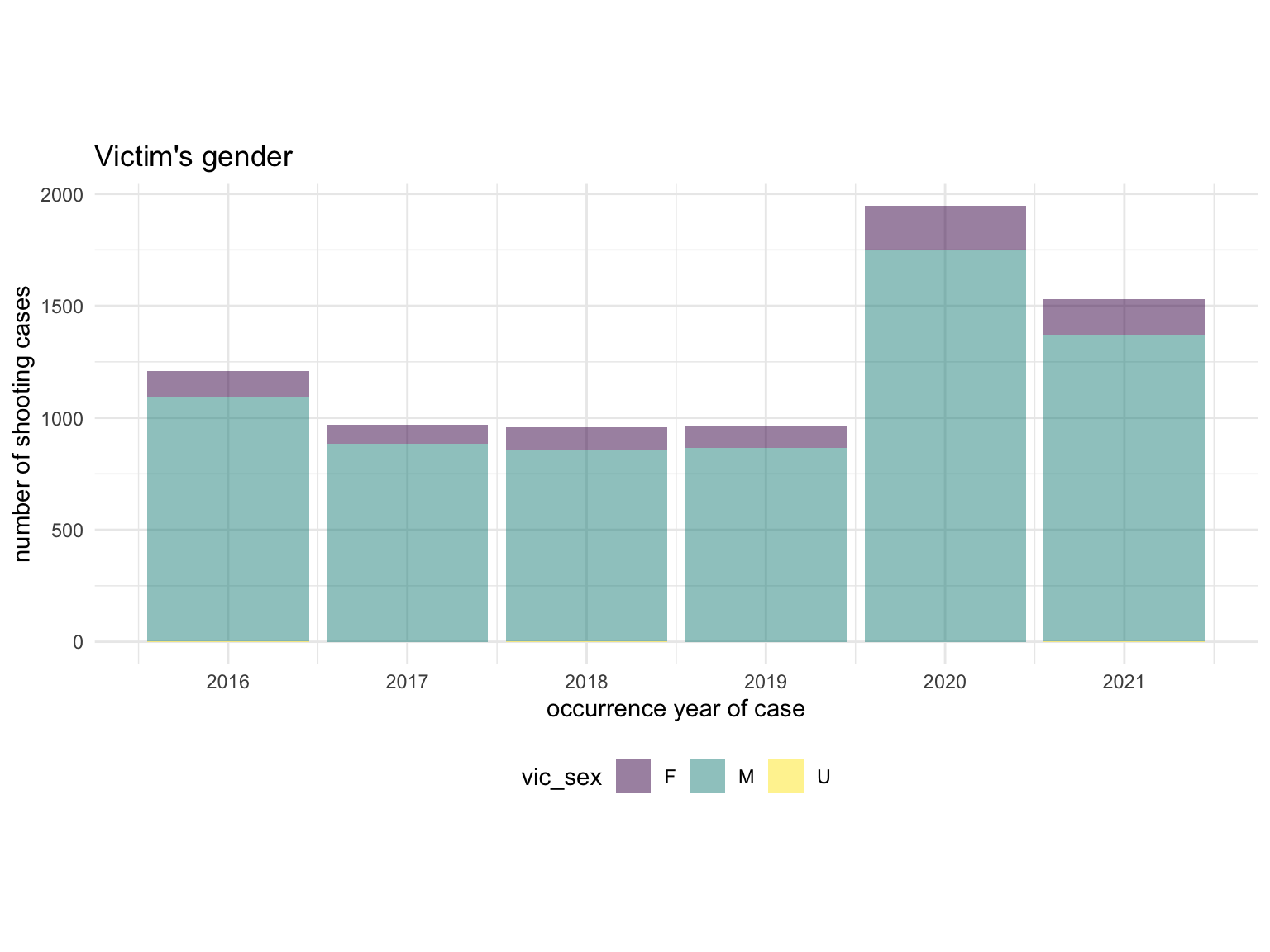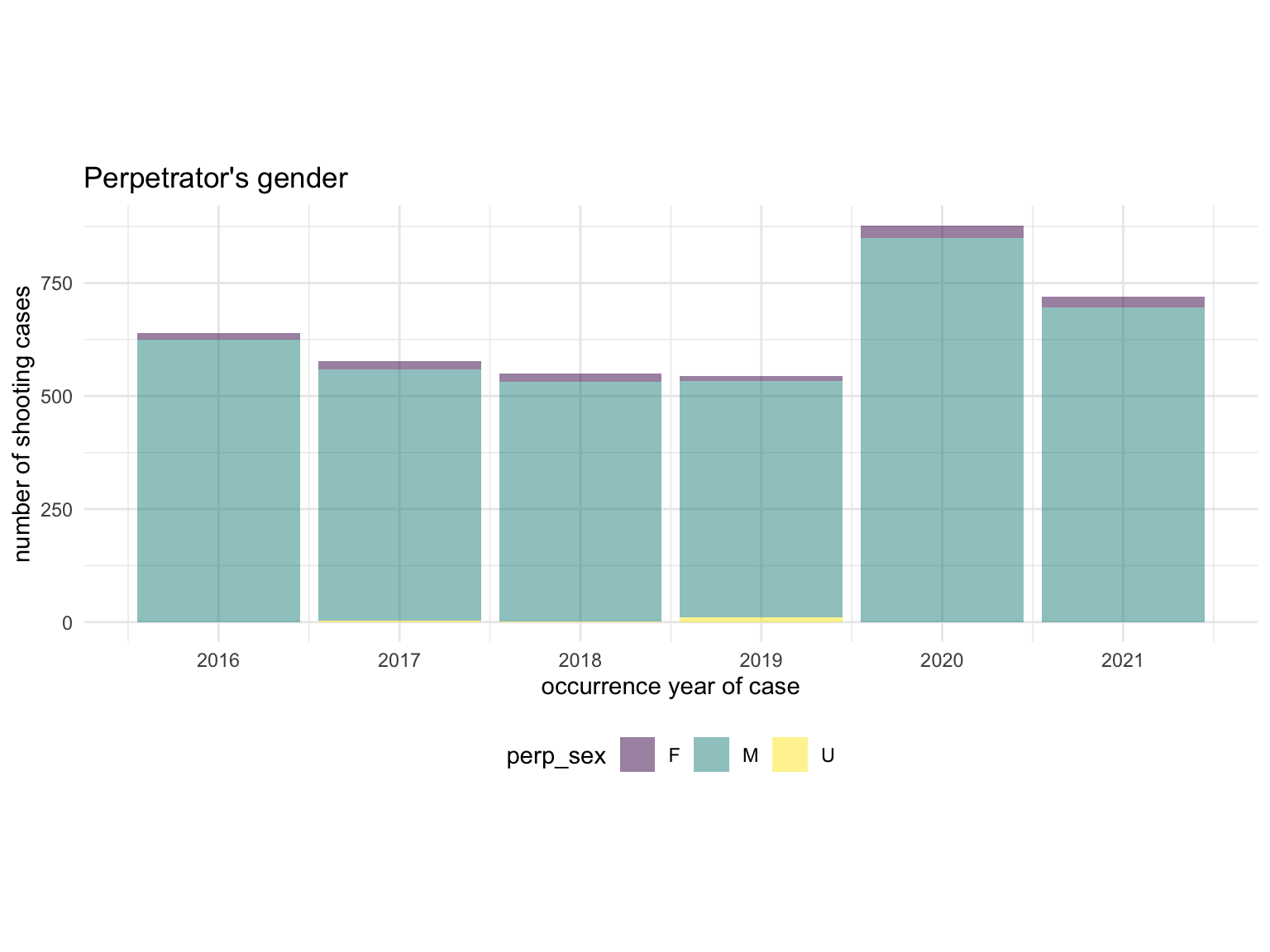 ggplot(aes(x = year, weight = n_freq, fill = perp_sex)) + geom_bar(position = "stack", aes(order = desc(perp_sex)), alpha = 0.5) +