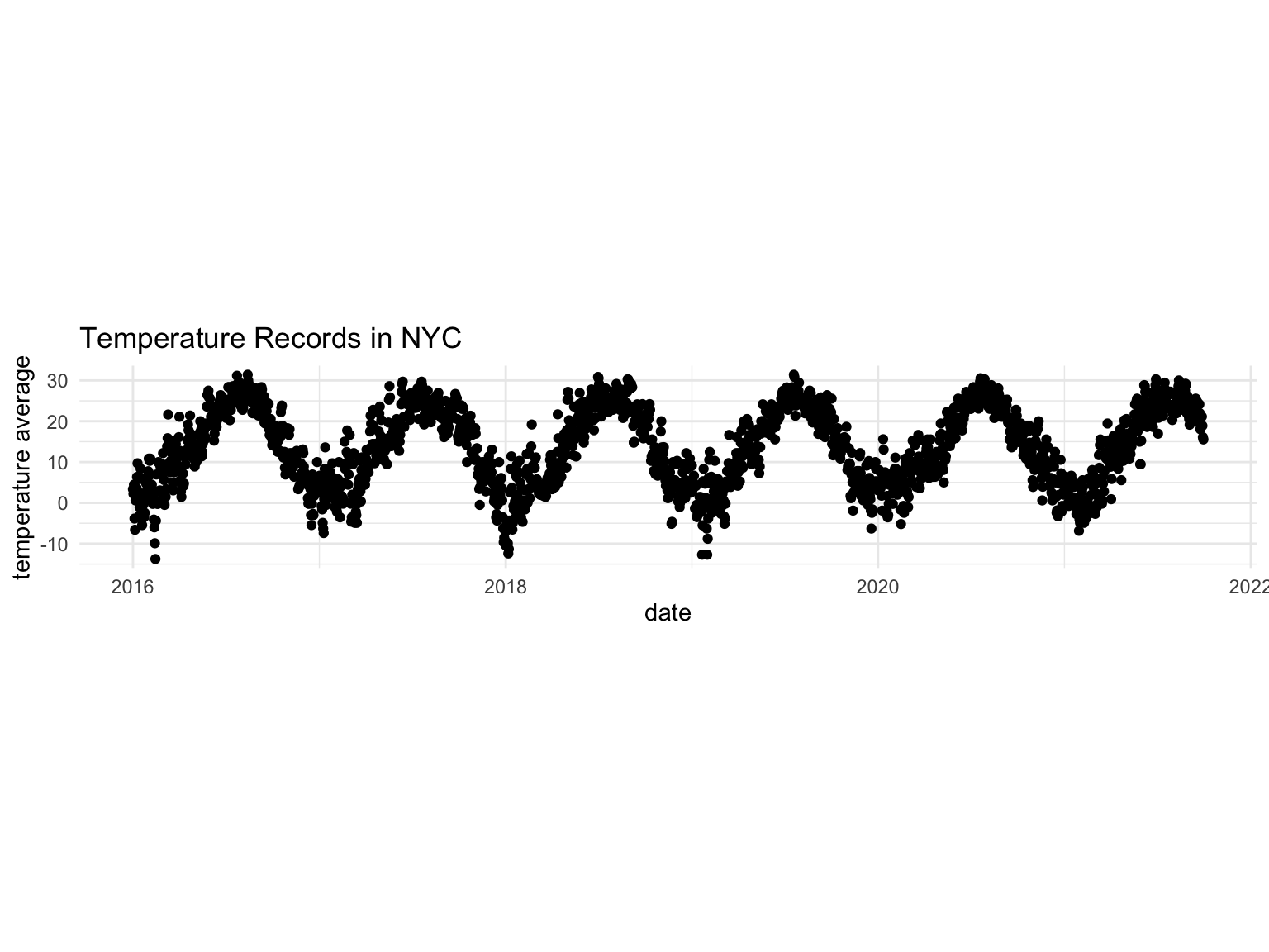 Based on the fact that shooting cases in summer are more than in winter, we are interested in the question whether the frequency of shooting cases is influenced by temperature. To observe the relationship between temperature and frequency of shooting, we collected weather data from rnoaa package and calculated the average temperature in New York Central Park as a substitute for temperature in NYC.